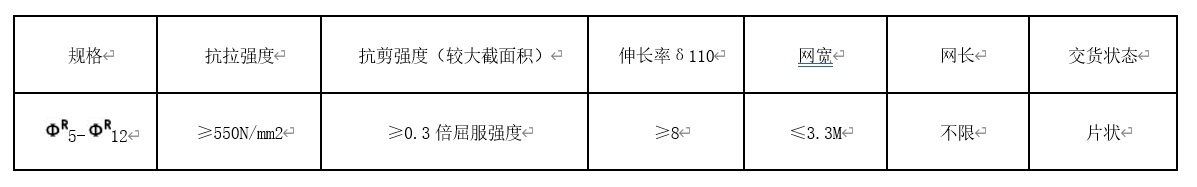 種類: 1、冷軋帶肋鋼筋焊接網; 2、光面鋼筋焊接網; 3、新三級鋼焊接網; 原料:高速專用線材; 工藝: 鋼筋焊接網是具有相同或不同直徑的縱向和橫向鋼筋,他們分別以一定的間距垂直排列,全部交叉點均用電阻電焊焊在一起成為鋼筋網片; 特點: 1、更低重量,更低成本,更好工程質量 2、根據(jù)等強度代換原理,并考慮到使用鋼筋焊接網的搭接、最小配筋率等因素,可以節(jié)約鋼材30%以上 3、均勻的間隔、精確的定位使能達到良好的抗裂性能 應用: 鋼筋焊接網被公認為是一種新型、高效、優(yōu)質的鋼筋混凝土結構鋼材而被大量應用在工業(yè)與民用建筑的樓板、墻體、屋蓋、地坪、橋面鋪裝、隧道襯砌、水利設施、預制管、樁等方面; 技術指標: